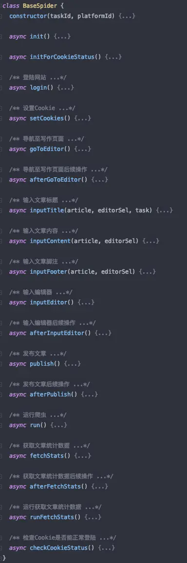 为了让爬虫显得不那么乱七八糟,我们将发布文章的各个步骤抽离了出来,形成了一个基类(因为我们可能不止掘金一个平台要抓取,使用面向对象的思想编写代码的话,其他平台只需要继承基类就可以了)。