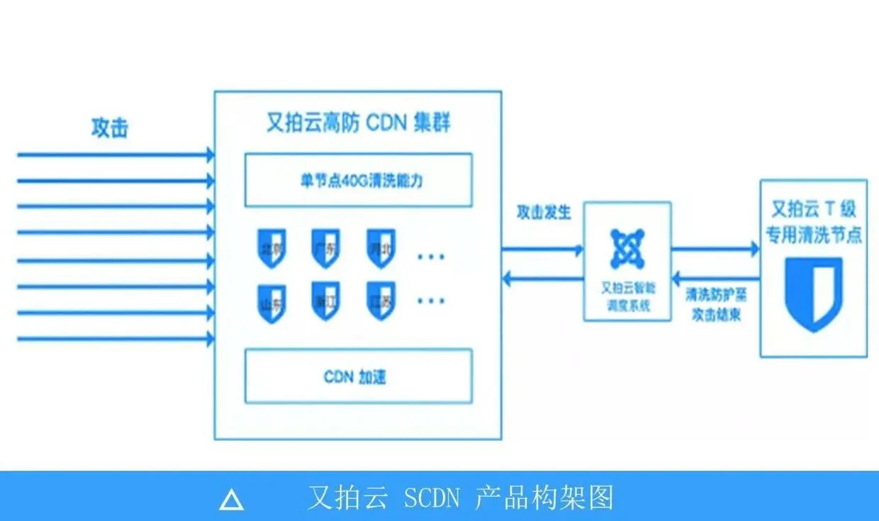 又拍云安全加速 SCDN (Secure Content Delivery Network),是又拍云针对分布在全球的各行业客户,提供的 DDoS 防护和 CDN 加速组合式解决方案。该产品衍生自又拍云自有 CDN 业务的新高防 CDN 集群,每个边缘节点具有 40G 的防护清洗能力,且客户可使用又拍云 CDN 全部基础功能,实现“边加速,边防护”的效果。攻击发生时,又拍云 SCDN 智能调度系统会自动感知并牵引流量至防御能力高达 1T 的专用清洗节点,安全护航业务。