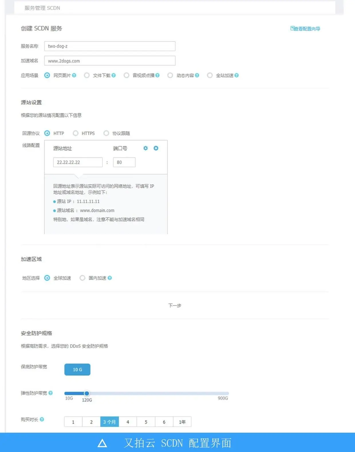 没有任何意外,又拍云 SCDN 得到了领导首肯,二狗子终于可以大展身手了。登入公司账号,果断的配置了一个服务。嗯,不错不错,功能齐全,普通 CDN 的功能它全都有,而且还有高防功能。既能防攻击又能加速网站,简直就是老铁 666 呀!领导再也不用担心网站的速度和安全问题啦!