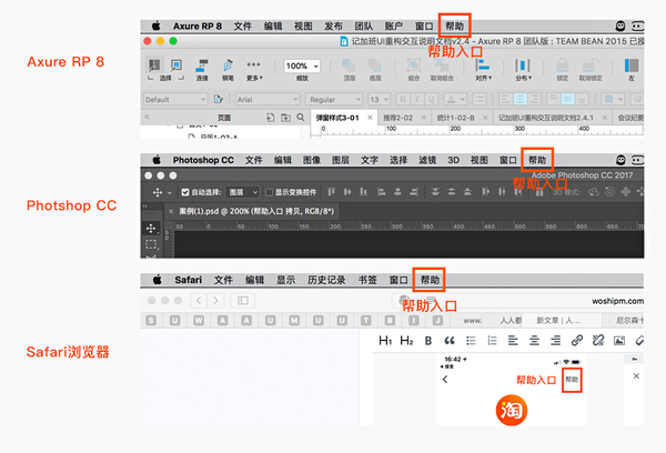 比如mac上一些常用的大型软件:原型制作工具Axure RP 8软件、图像编辑软件Photshop CC以及mac上的Safari浏览器,在顶部状态栏上都有有一个“帮助”的入口,也体现了帮助文档的必要性,所以,不管是什么样的产品都要给用户提供一个帮助的入口,用来解决用户操作过程中遇到的问题,如下图: