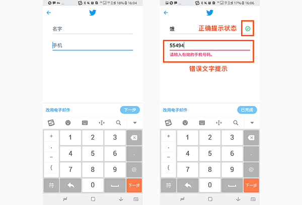 例如Twitter注册页面的错误提示:用户在注册Twitter账号时,第一步要输入名字和手机号码,当用户输入正确的时候,输入框后边会有绿色的对勾圆圈,提示用户输入正确,可以进入下一步操作了,而当用户输入错误的时候,输入框会变为红色并且在下方出现红色字的错误提示,这样让用户很清楚的知道用户输入错误以及错误的原因,这样用户就知道怎么修改了,这也是容错原则的一种体现,如下图: