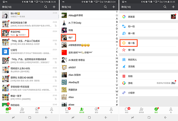 例如微信几个关键界面的字体:下图我用红色框框起来的条目部分的文字,三个主界面不尽相同,但是,字体大小、颜色、布局的样式都一样,这样让整个APP视觉上看起来很舒服,这就是字体一致性,因此,我们在做视觉设计的时候尽量使用同意风格的文字。