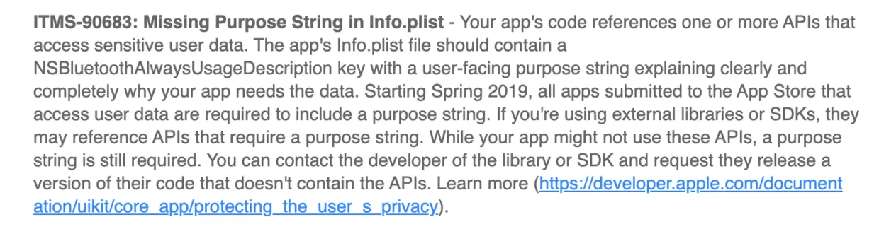 在iOS13之前,无需权限提示窗即可直接使用蓝牙,但在iOS 13下,新增了使用蓝牙的权限申请。最近一段时间上传IPA包至App Store会收到以下提示。