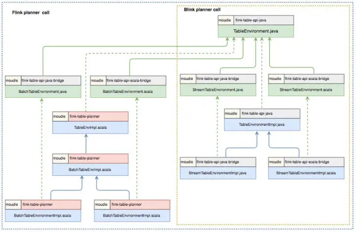 结合 Flink planner 和 Blink planner, 进一步梳理 TableEnvironment 的组织关系,我们可以注意到一些有趣的细节: