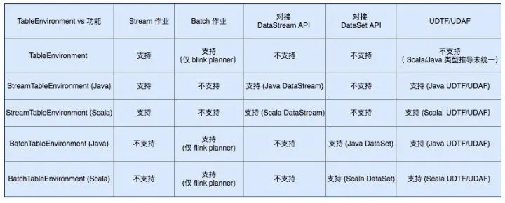TableEnvironment 支持功能对比