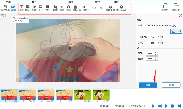 5、也可以点击播放按钮进行预览,如果不太满意的话可以进行编辑。在页面的上方有很多编辑GIF的工具,如插入文字、图片,旋转、裁剪、减少帧数的工具等。
