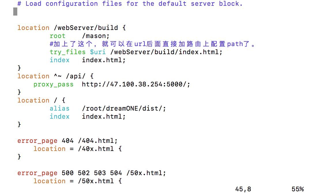 /usr/local/nginx/conf/nginx.conf, 我们可以通过vim 文件目录打开nginx配置文件进行编辑。 -
