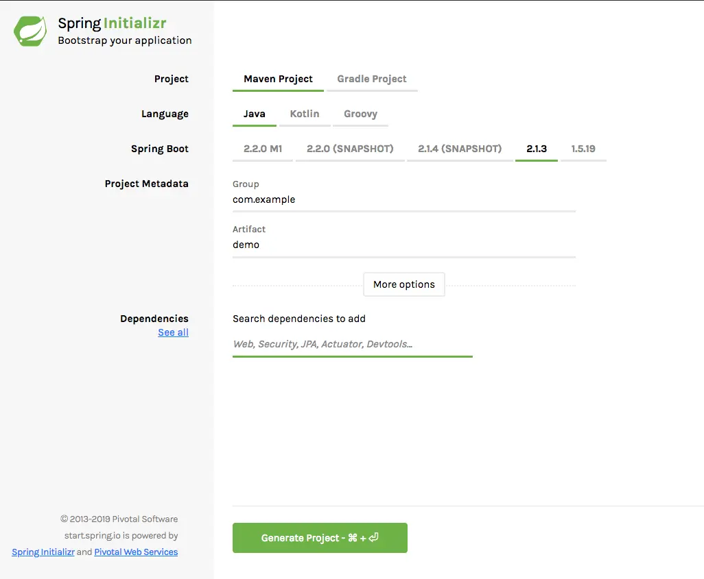 Spring Boot:选用的Spring Boot版本;这里将使用当前最新的2.1.3版本。