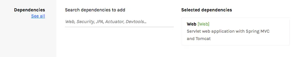 Dependencies:选择要加入的Spring Boot组件;本文将实现一个Http接口,所以可以选择Web组件,只需要输入Web,页面会自动联想显示匹配的可选组件: