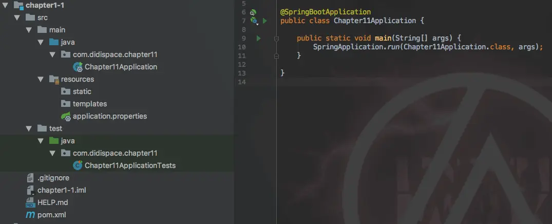 生成的Chapter11Application和Chapter11ApplicationTests类都可以直接运行来启动当前创建的项目,由于目前该项目未配合任何数据访问或Web模块,程序会在加载完Spring之后结束运行。