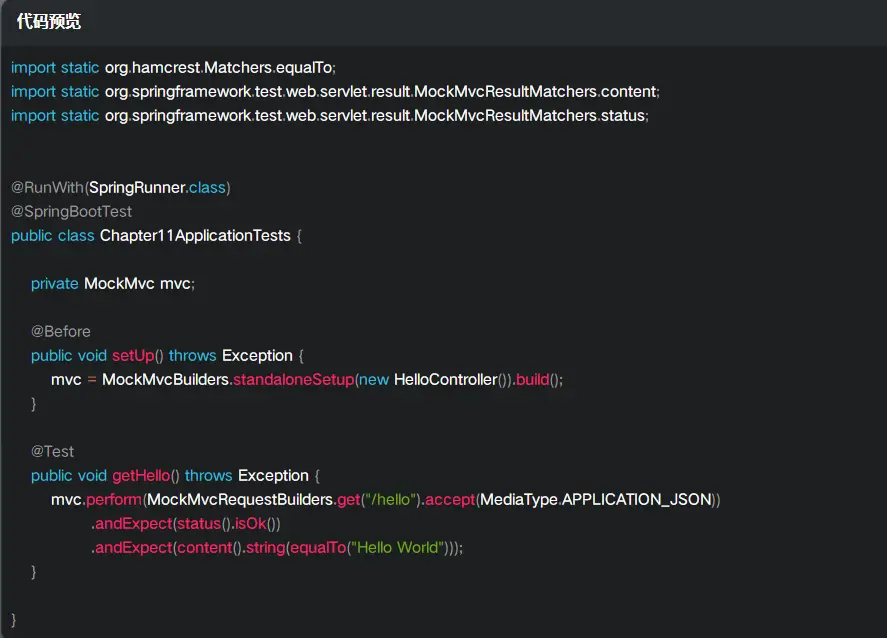打开的src/test/下的测试入口Chapter11ApplicationTests类。下面编写一个简单的单元测试来模拟http请求,具体如下: