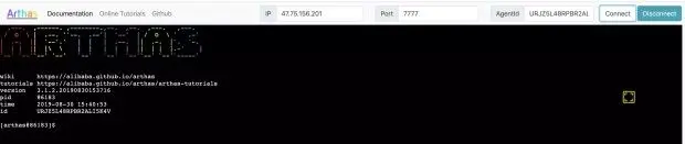 TUNNEL_SERVER ws://47.75.156.201:7777/ws以上面的为例,在浏览器里访问 http://47.75.156.201:8080/ ,输入 agentId,就可以连接到本机上的arthas了。