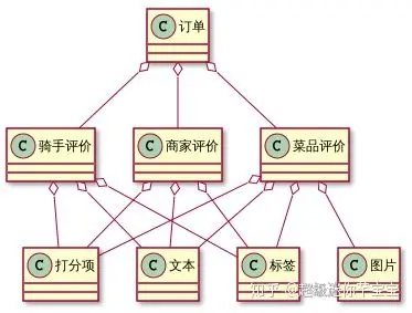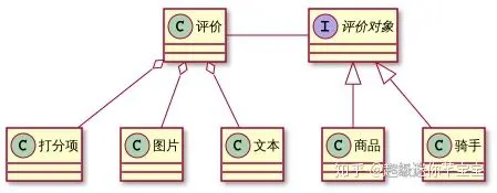 回到前面提到的评价域模型,后来在和产品多次沟通后意识到,产品没有希望评价这么多种类,对它来说商品也好、骑手也好,都属于被评价的对象,从领域模型来看,之前的设计更多是面对场景,而不是面对行为,所以合理的域模型应该是: