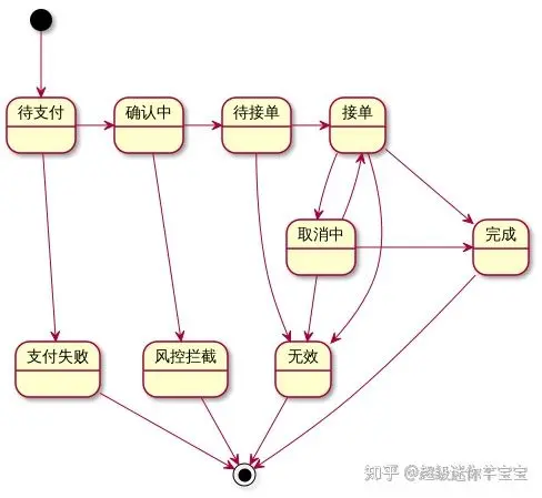 拥有模式固然是好的,比如搜索系统里,通过Template Method模式,定义一套完整的搜索参数解析模版,只需要增加配置就可以定制不同的查询诉求。这里最想强调的是不要设计模式驱动编程,拿交易系统里的状态机来举例子(状态机简直太常见了,简单如家里使用的台灯,都有一个开和关的状态,只是交易场景下会更加复杂),在餐饮外卖交易有如下的状态流转模型: