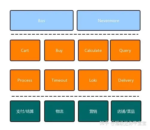 系统名称主要功能Bosc端订单管理:用户详情、列表Nevermoreb端订单管理:商户接单等Cart购物车Buy下单Calculate金额计算Process订单处理,管理订单生命周期Query订单查询Timeout超时中心Loki订单取消、退Delivery交付中心