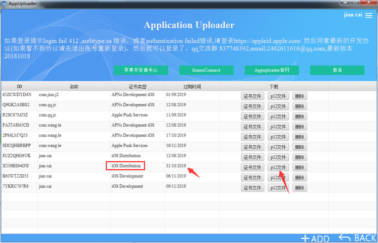 2.1、用苹果开发者账号登录appuploader软件后,选择证书进入,点击右下角+ADD选择