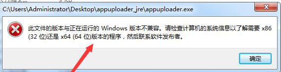 如果win 32位系统点击appuploader.exe启动时提示(下图所示),32位系统需要点击appuploader.jar或者start.bat启动