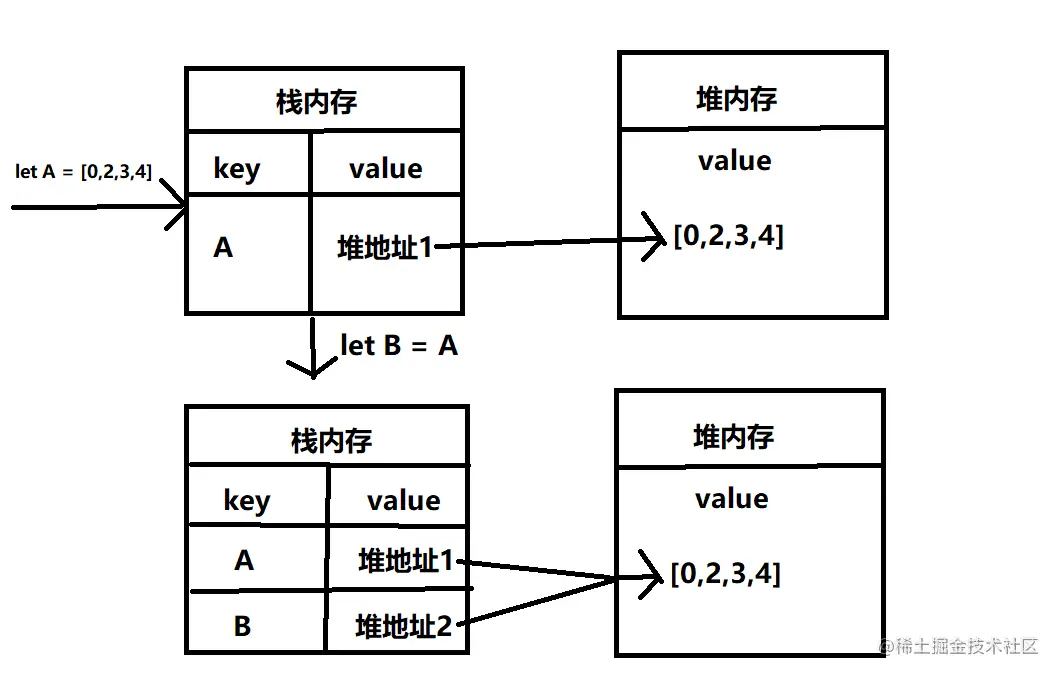 引用类型的键存储在栈内存中,值存储在堆内存中,但是栈内存会提供一个指向堆内存值的地址。