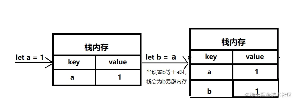 因为变量a和变量b的处于的栈内存在不同位置,改变变量a的值时,变量b不会随着a改变而改变,这就是深拷贝。