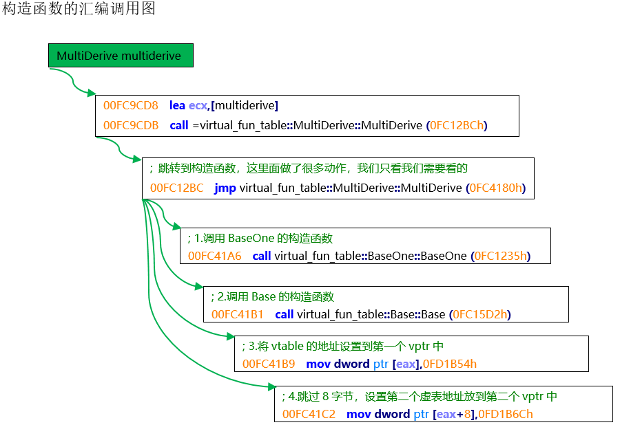 在上面的代码将宏放开#define test_call_abstract_virtual_fun 1,编译通过ok,接下来可以愉快的玩耍了。 代码整理好,反汇编走起来。我把重要的调用过程画图表示出来,便于理解。