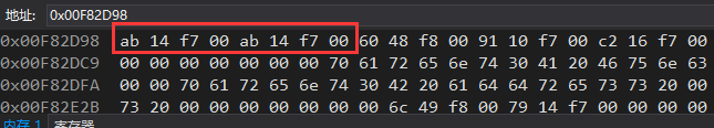 在反汇编的时候,我们拿到了虚表的地址0x0F82D98,我们把这个地址放到vs2013中的内存窗口中。根据我们前面的学到的知识,就知道AbstractBase应该有两个虚函数,那么表中应该有两个函数指针,如下图所示。但是你会惊讶的发现表中的两个函数指针都是0x00f714ab。