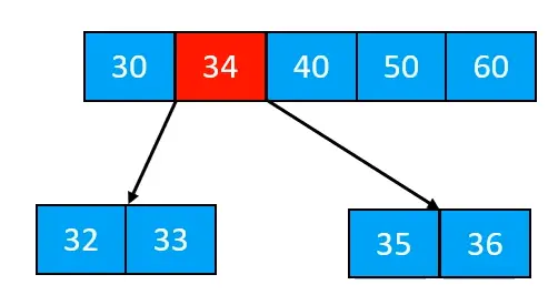 当节点发生上溢时,此时该节点的元素个数必然等于该B树的阶数,如下图的一个5阶B树节点,添加一个元素后