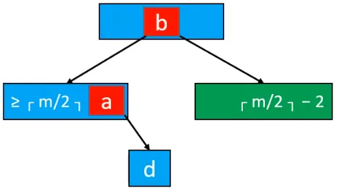 此时就需要将付节点的元素b挪下来和左右子节点进行合并[下图],合并后的节点元素个数等于⌈m / 2⌉ + ⌈m / 2⌉ - 2 ,不超过 m - 1