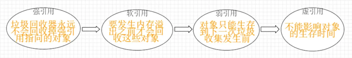 在java中,可以作为GC Roots的对象有4种:1).虚拟机栈(栈帧中的本地变量表)中引用的对象 2).方法区中类静态属性引用的对象 3).方法区中常量引用的对象 4).本地方法栈中JNI(即一般说的Native方法)引用的对象b).对象引用:java中定义了四种引用,引用强度从强到弱依次是 强引用、软引用、弱引用和虚引用。