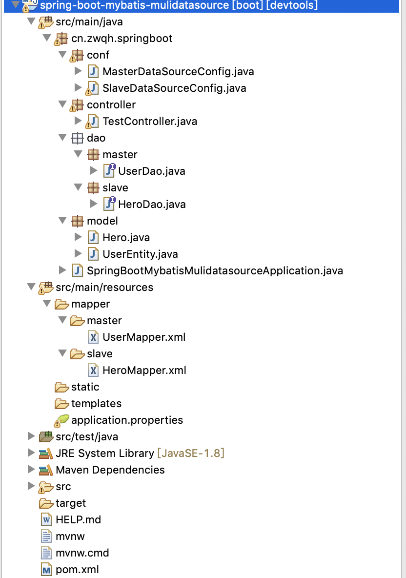 db_test 数据库的 dao 层在 cn.zwqh.springboot.dao.master 包下,db_test2 数据库的 dao 层在 cn.zwqh.springboot.dao.slave 包下。