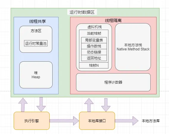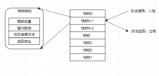 虚拟机栈(Java Virtual Machine Stacks)也是每个线程私有的一块内存空间,它的生命周期与线程相同。虚拟机栈描述的是 Java 方法执行的内存模型:每个方法被执行的时候都会同时创建一个栈帧(Stack Frame)用于存储局部变量表、操作数栈、动态链接、方法出口等信息。每一个方法被调用直至执行完成的过程,就对应着一个栈帧在虚拟机栈中从入栈到出栈的过程。