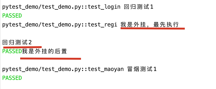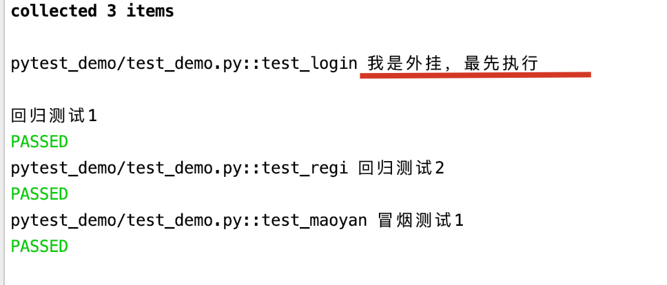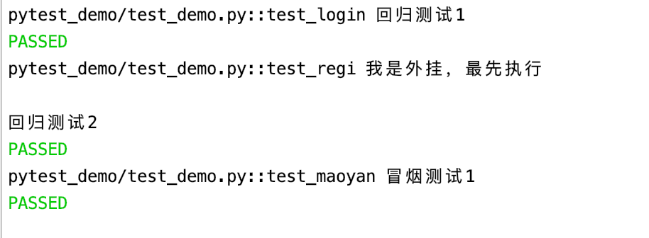 import pytest @pytest.mark.general def test_login(): print "回归测试1" @pytest.mark.general def test_regi(): print "回归测试2" @pytest.mark.general @pytest.mark.maoyan def test_maoyan(): print "冒烟测试1" #在模块运行前执行一次 @pytest.fixture(scope="module",autouse=True) def waigua(): print "我是外挂,最先执行\n"执行结果是: