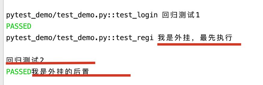 @pytest.mark.usefixtures("fixture函数名")调用import pytest @pytest.mark.general def test_login(): print "回归测试1" @pytest.mark.usefixtures("waigua") @pytest.mark.general def test_regi(): print "回归测试2" @pytest.mark.general @pytest.mark.maoyan def test_maoyan(): print "冒烟测试1" @pytest.fixture() def waigua(): print "我是外挂,最先执行\n"如果一个方法或者一个class用例想要同时调用多个fixture,可以使用@pytest.mark.usefixture()进行叠加。注意叠加顺序,先执行的放底层,后执行的放上层。