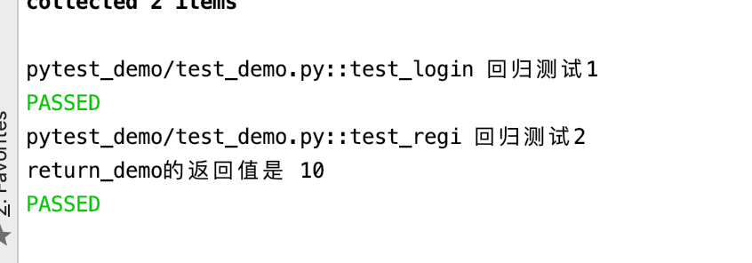 #test_demo.py import pytest @pytest.mark.general def test_login(): print "回归测试1" @pytest.mark.general def test_regi(return_demo): print "回归测试2" print "return_demo的返回值是",return_demo执行结果是:
