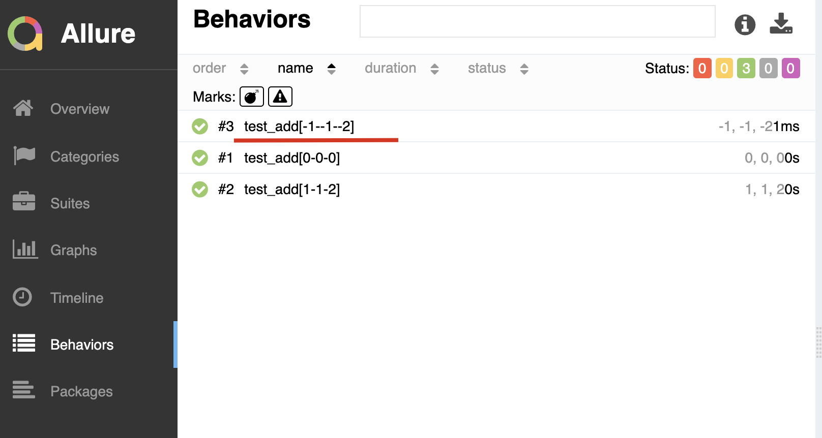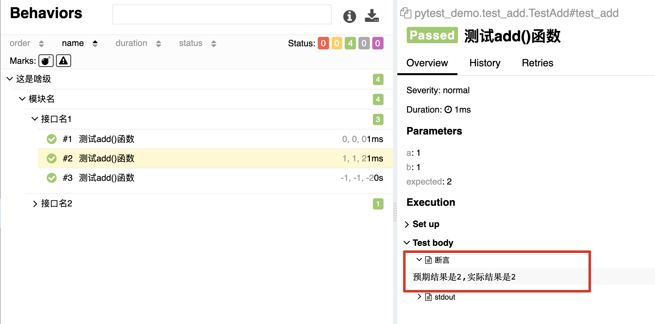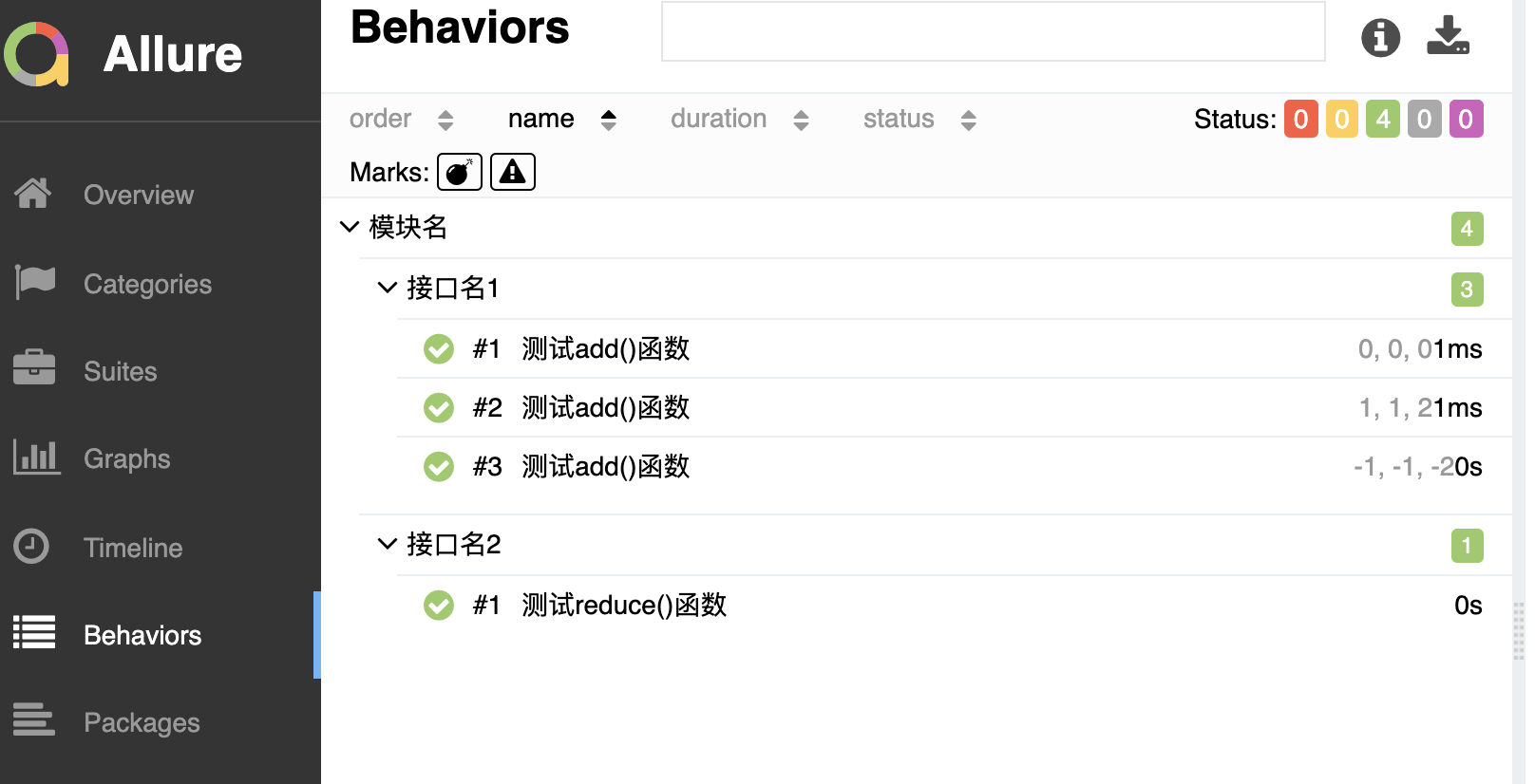 import allure from pytest_demo.add import Add import pytest class TestAdd: data=[[0,0,0],[1,1,2],[-1,-1,-2]] @allure.feature("模块名") @allure.story("接口名1") @allure.title("测试add()函数") @pytest.mark.parametrize("a,b,expected",data) def test_add(self,a,b,expected): res=Add(a,b).add() print res try: assert a+b==expected except AssertionError as e: print "测试用例失败:{0}".format(e) raise e finally: print "a是{0},b{1},expected{2}".format(a,b,expected) @allure.feature("模块名") @allure.story("接口名2") @allure.title("测试reduce()函数") def test_reduce(self): print "测试减法接口"执行结果: