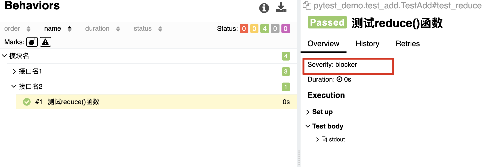 @allure.severity("blocker") @allure.feature("模块名") @allure.story("接口名2") @allure.title("测试reduce()函数") def test_reduce(self): print "测试减法接口"执行结果: