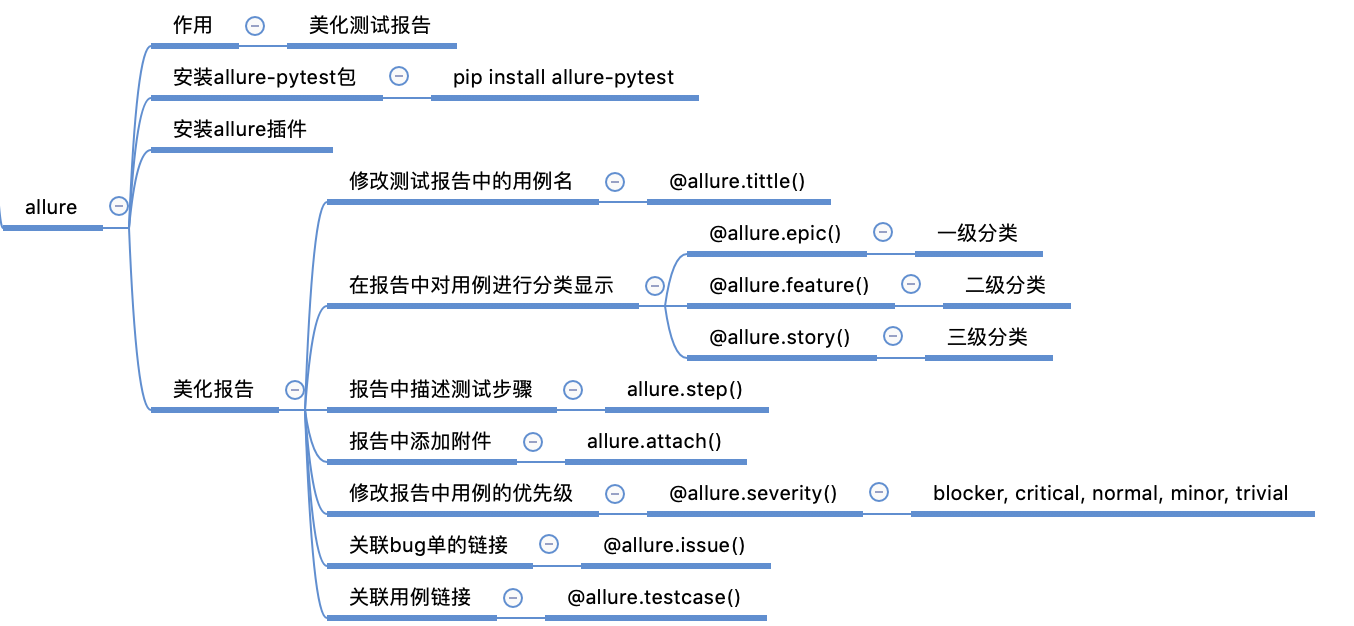 @allure.issue(url,name)@allure.issue("http://www.baidu.com","bug链接") @allure.severity("blocker") @allure.feature("模块名") @allure.story("接口名2") @allure.title("测试reduce()函数") def test_reduce(self): print "测试减法接口"