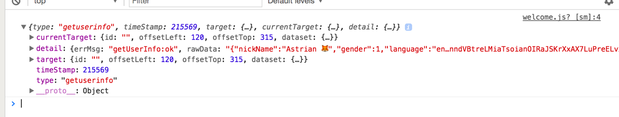 可以看到,在这么多的数据中,微信将用户数据包裹在这个对象里的 detail.userInfo 中。尝试输出其中 detail.userInfo 的内容,就可以看到干净的用户资料了。