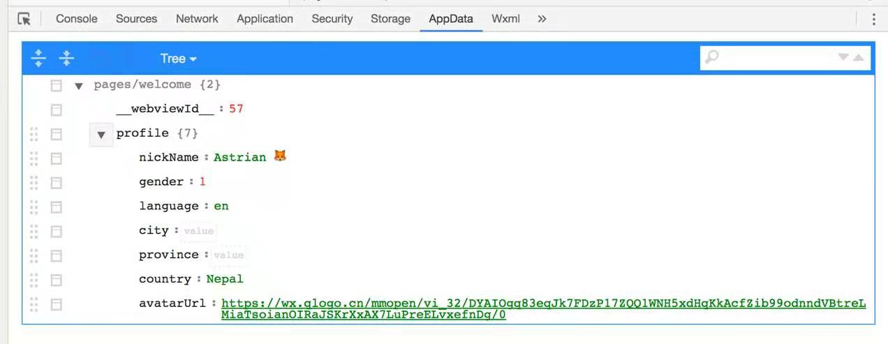 点击调试器的「App Data」标签,我们可以看到页面对象 Page 中,所有的变量。尝试重新编译小程序,点击按钮再过一会,就会发现 profile 变量已经写入成功了。