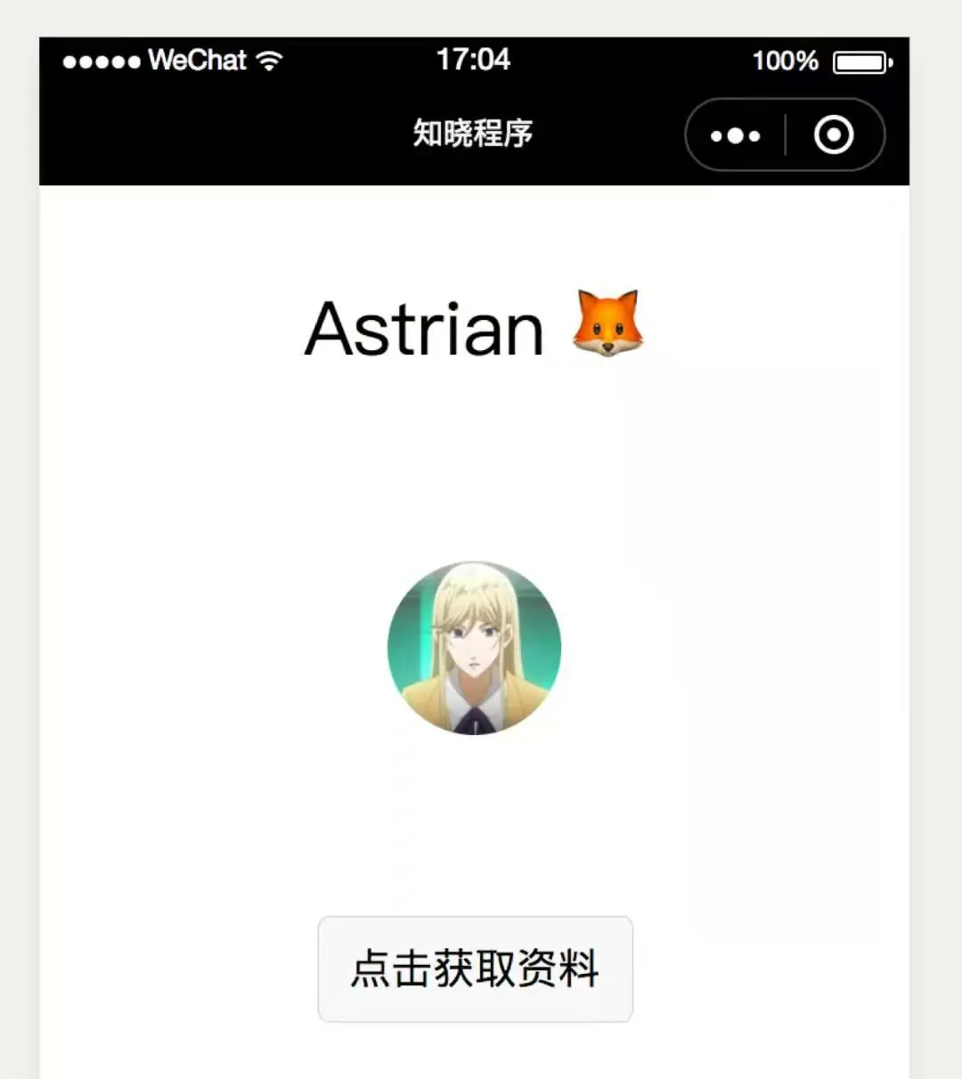 重新编译小程序,再点击按钮,可以看到小程序已经成功展示用户昵称和头像。