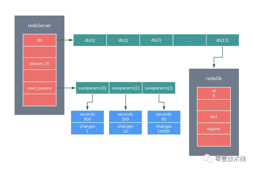 Redis 中的每个数据库都由一个 redis.h/redisDb 结构表示,它记录了单个 Redis 数据库的键空间、所有键的过期时间、处于阻塞状态和就绪状态的键、数据库编号等等。