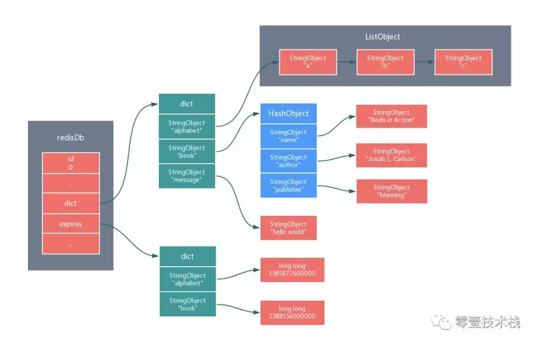 由于 Redis 是一个键值对数据库(key-value pairs database), 所以它的数据库本身也是一个字典,对应的结构正是 redisDb。其中,dict 指向的是一个记录键值对数据的字典,它的键是一个字符串对象,它的值则可以是字符串、列表、哈希表、集合和有序集合在内的任意一种 Redis 类型对象。 expires 指向的是一个用于记录键的过期时间的字典,它的键为 dict 中的数据库键,它的值为这个数据库键的过期时间戳,这个值以 long long 类型表示。