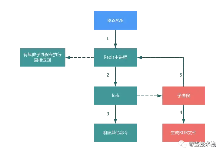 BGSAVE 是触发 RDB 持久化的主流方式,下面给出 BGSAVE 命令生成快照的流程: