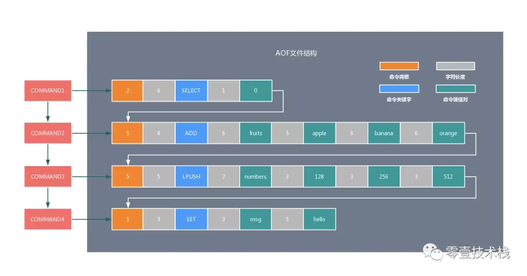 如图所示,将 RDB 数据文件的内容和增量的 AOF 命令文件存在一起。这里的 AOF 命令不再是全量的命令,而是自持久化开始到持久化结束的这段时间服务器进程执行的增量 AOF 命令,通常这部分 AOF 命令很小。