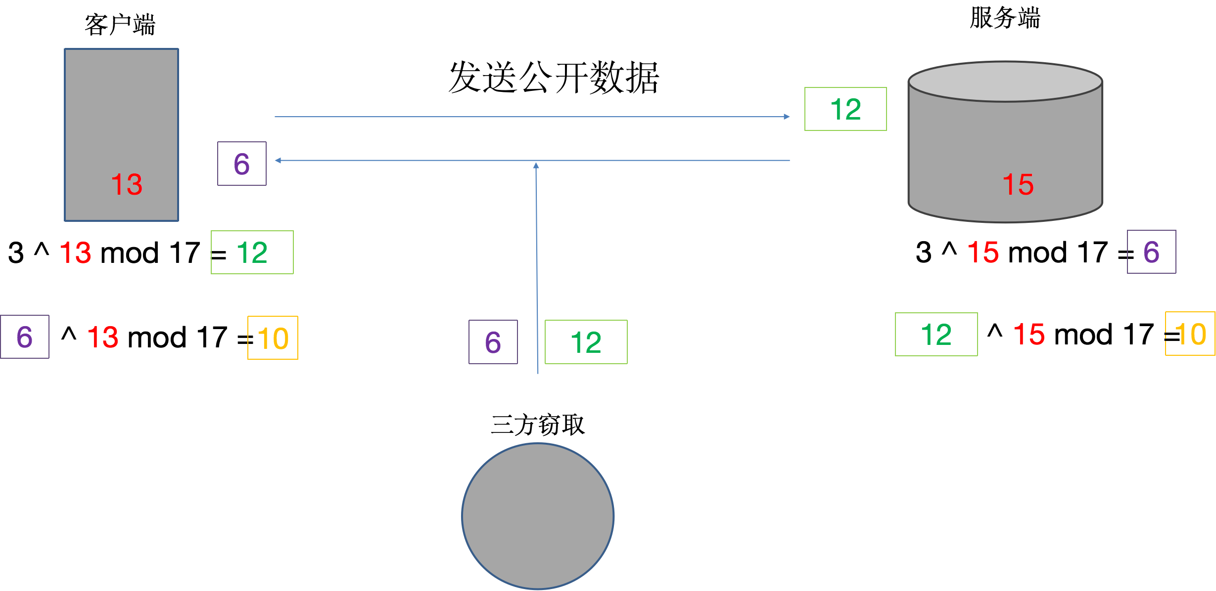 13是客户端随机数,经过商定的加密算法运算后 得到12 发送给服务端。 15是服务端随机数,经过商定的加密算法运算后 得到6 发送给客户端。 中间人虽然能窃取到发送的6 和12 , 但是并没有什么卵用。 客户端使用服务端传过来的6, 加上客户端随机数,使用商定的加密算法算出一个结果10 , 服务端使用客户端传过来的 12,加上服务端随机数使用商定的加密算法 结果也是10, 结果10是由双方的随机数, 加上共同的预祝秘钥(3和17),共同计算得出的结果,因此10也就是https中对称加密的私钥。保证了传输的安全。
