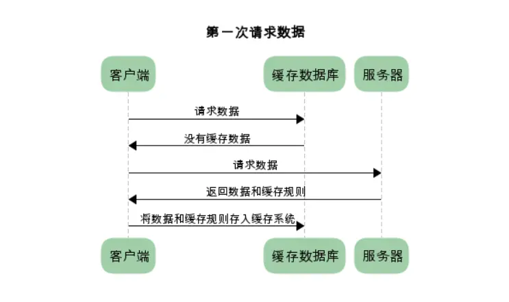 在客户端第一次请求数据时,此时缓存数据库中没用对应的缓存数据,需要请求服务器,服务器返回后,将数据存储至缓存数据库中。