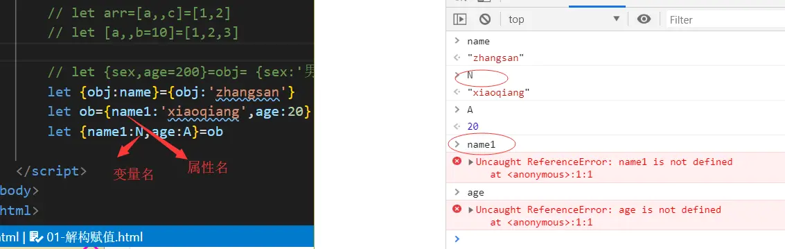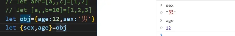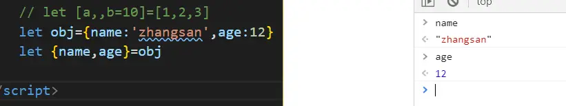 let {name,age}=obj;做了两件事 - 定义了两个变量(name,age) - 给这两个变量赋值 当运行完成后,会多出两个变量--name,age