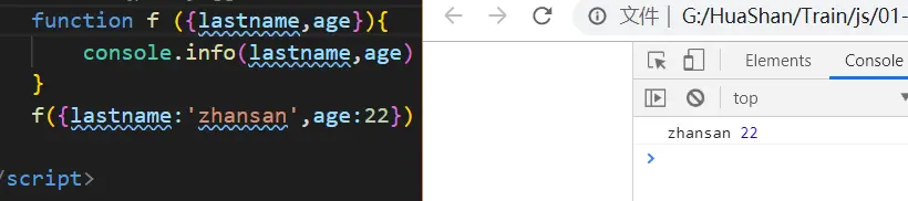 上面的形参列表中**{lastname,age}相当于定义两个变量,通过对象的解构赋值给它们设置值,对应属性名同样必须相同才能被匹配到,否则是undefined**