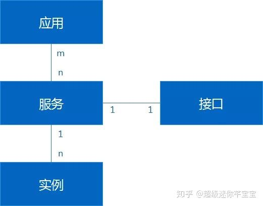 在服务数据模型方面,我们直接复用了现有 SOA 服务的数据模型。如图所示,最核心的服务模型对应的是 Dubbo 中的一个 interface 。一个应用程序内可以包含多个服务,一个服务也可以部署在多个服务器上。我们将每个服务器上运行的服务应用称为服务实例。