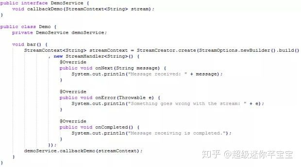 这段代码与前面的代码有什么区别?首先, callback 接口的参数替换为了一个 StreamContext 。还有接受回调的地方不是之前的全局唯一实例,而是一个匿名类,并且也不再是单单一个方法,而是有3个方法,onNext、onError和onCompleted 。这样调用方在匿名类里就可以通过闭包来获取原本请求的上下文信息了。是不是体验就好一些了?