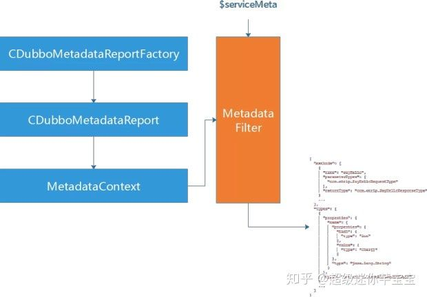 首先就是怎么构造请求。这个问题实际分为两个部分。一个是用户在不写代码的前提下用什么格式去构造这个请求。考虑到很多测试人员对 Restful Service 的测试比较熟悉,所以我们最终决定使用 JSON 格式表示请求数据。那么让一个测试人员从一个空白的 JSON 开始构造一个请求是不是有点困难呢?所以我们还是希望能够让用户了解到请求的数据模型。虽然我们使用的是 Dubbo 2.5.10 ,但这部分功能在 Dubbo 2.7.3 中已经有了。所以我们将这部分代码复制了过来,然后对它进行了扩展,把服务的元数据信息保存在一个全局上下文中。并且我们在 CDubbo 中通过 Filter 增加了一个内部的操作,$serviceMeta,把服务的元数据信息暴露出来。这部分元数据信息包括方法列表、各个方法的参数列表和参数的数据模型等等。这样用户通过调用内部操作拿到这个数据模型之后,可以生成出一个基本的JSON结构。之后用户只需要在这个结构中填充实际的测试数据就可以很容易的构造出一个测试请求来。